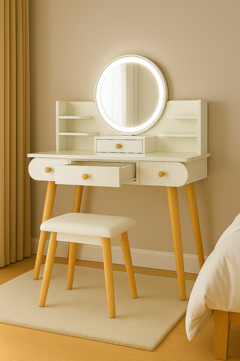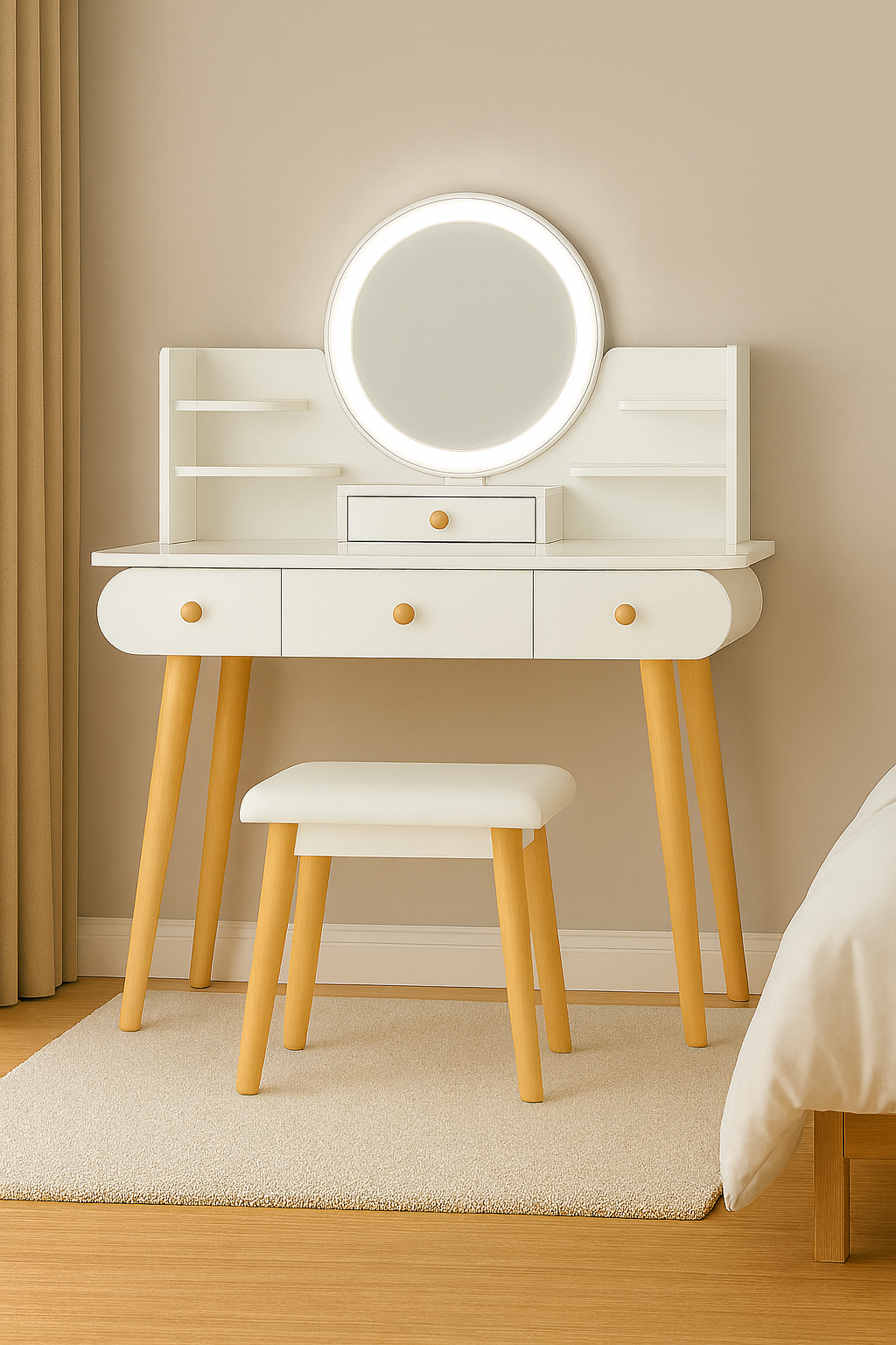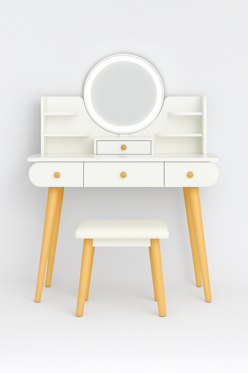Sto za šminkanje Lumi Plus donosi jednostavnost i eleganciju u vaš prostor. Opremljen je okruglim LED ogledalom koje pruža savršeno osvetljenje za svakodnevno uređivanje, dok četiri fioke nude dovoljno mesta za šminku, kozmetiku i sitne dodatke. Kompaktan je, ali maksimalno funkcionalan — idealan za spavaće sobe, dečije sobe ili manje stanove. Drvene nogice daju toplinu prostoru, a čista bela površina uklapa se u svaki enterijer. Mala praktična stolica izrađena u istom maniru savršen je dodatak ovom stolu.